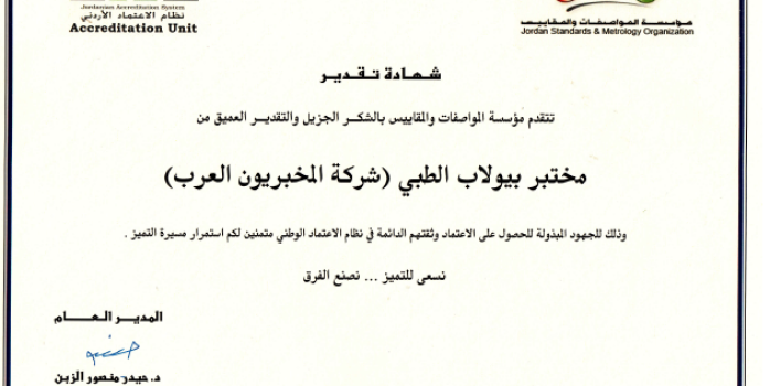 Dr Hayder Al Zaben, the Director of the Organization, along with Mrs. Lana Marashdeh, the Director of the Accreditation Unit, handed out appreciation certificates for those accredited laboratories, biolab is one of only three medical laboratories to have the ISO 15189 accreditation in Jordan. It is an honor to be appreciated and we always look forward to continuous improvement.