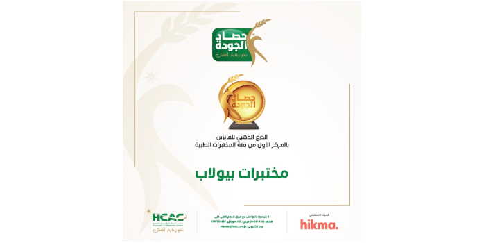 (عمان، الأردن - نوفمبر 2021) حصل مختبر بيولاب الطبي، الرائد في المملكة، على الدرع الذهبي في مسابقة حصاد الجودة في المؤتمر السادس لمجلس اعتماد المؤسسات الصحية بعنوان "الجودة والسلامة بين واقع الجائحة وآثارها - مستعدون لحاضر جديد". وتهدف المسابقة إلى تشجيع المؤسسات الحاصلة على شهادات الاعتماد بالجودة على تطوير وتنفيذ برامج مبتكرة لتحسين جودة الخدمات الصحية المقدمة في الأردن والتكيف مع التغير المستمر الناجم عن أزمة الجائحة.